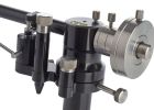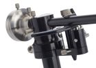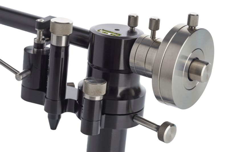 Precise fine tuning and repeatable adjustment of tonearm height by means of integrated bubble level and vertical threaded adjustment rod.