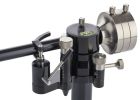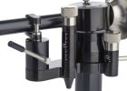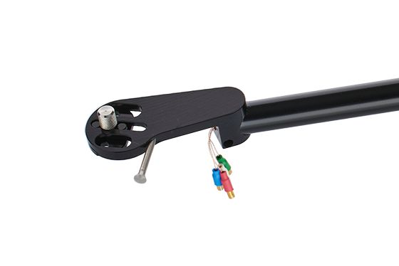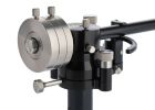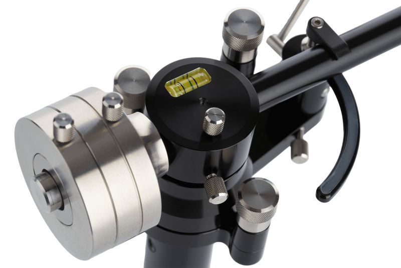 Precise fine tuning and repeatable adjustment of tonearm height by means of integrated bubble level and vertical threaded adjustment rod.